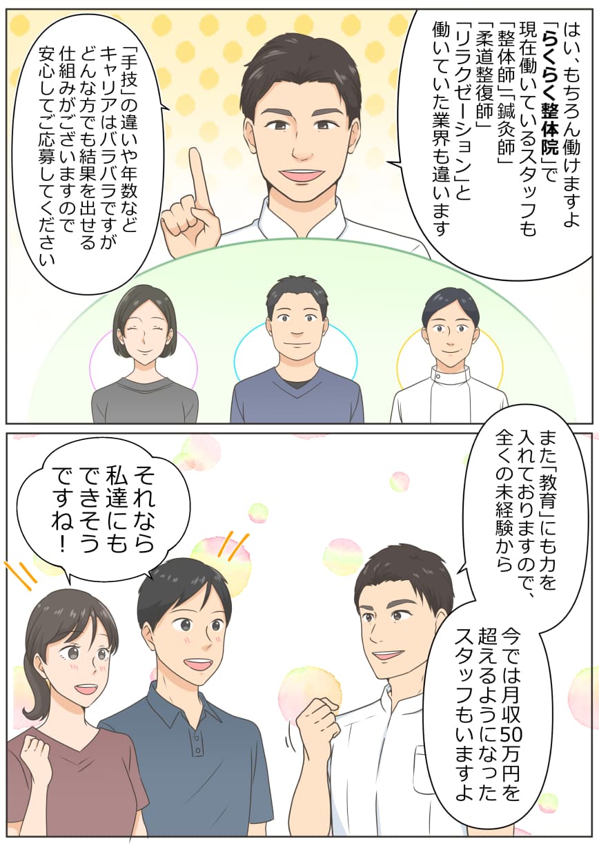プロの施術者として、自らの技術を磨き、共に仲間を育て、5年後、10年後の「らくらく整体院グループ」を一緒に創っていける仲間を求めています。